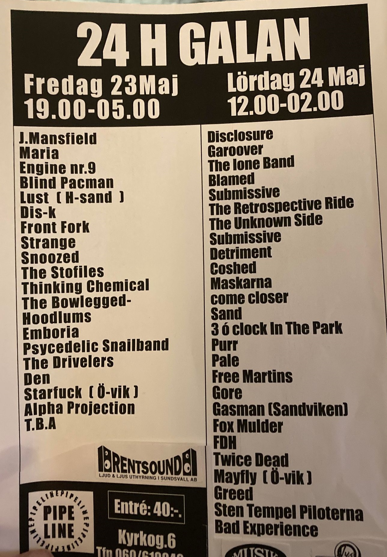 24-timmarsgalan våren 1997, dag 2: Disclosure, Garoover, The Lone Band, Blamed, Submissive, The Retrospective Ride, The Unknown Side, Detriment, Coshed, Maskarna, Come Closer, Sand, 3 O’Clock In The Park, Purr, Pale, Free Martins, Gore, Gasman, Fox Mulder, FDH, Twice Dead, Mayfly, Greed, Sten Tempel Piloterna, Bad Experience